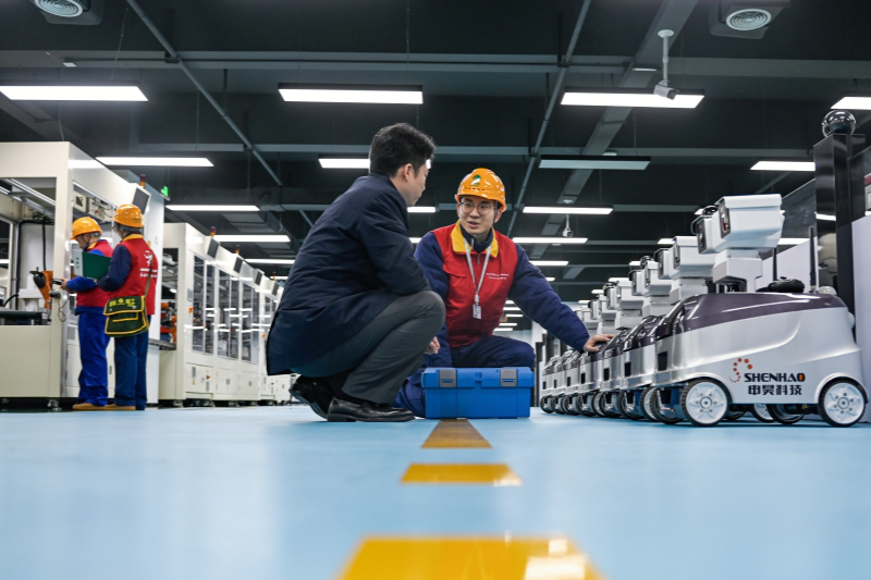 国网浙江杭州供电公司员工检查人工智能生产车间供电线路和用电设备。