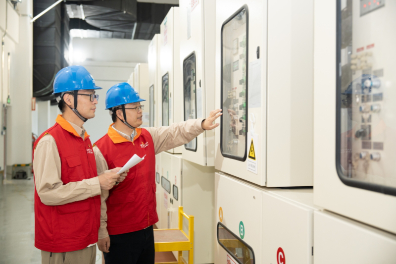 国网湖北武汉供电公司员工在长飞先进半导体基地配电室内协助客户开展安全用电检查。